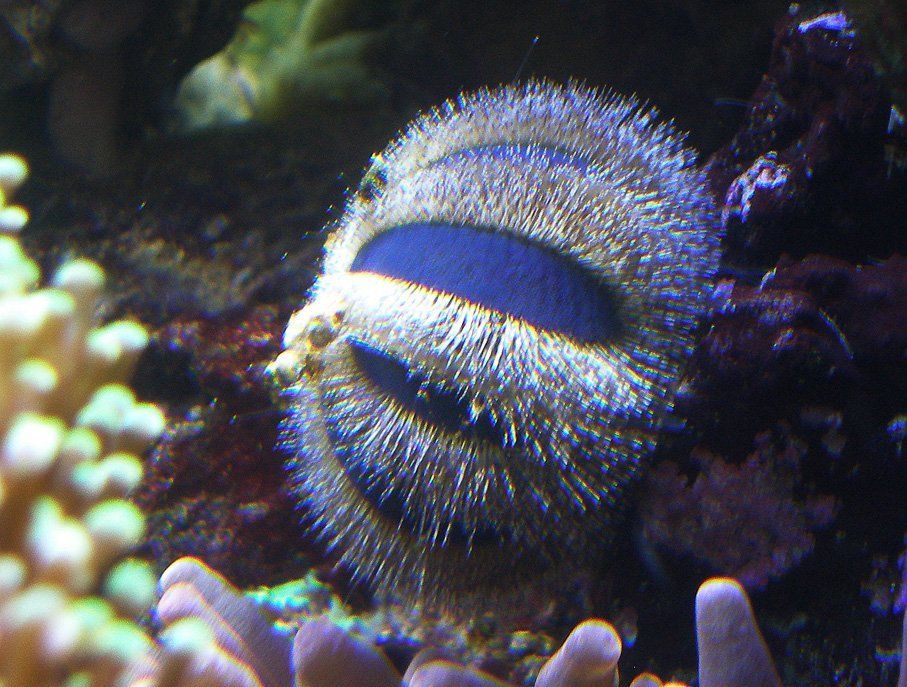 Zum Grundwissen für jeden künftigen Besitzer eines solchen Tieres gehört, dass alle Kugelfische oben und unten eine Zahnleiste besitzen, welche permanent nachwächst und nur durch das richtige füttern abgenutzt werden kann!!!! Dass heißt auf den Speiseplan müssen Muscheln, Garnelen, SPS-Korallen sowie auch Lebendgestein in welches er ab und zu einmal reinbeißen kann (um sich Mysis o.ä. einzufangen). Also alles, was hartschalig ist. Sollte sich also eine wunderschöne „Riesenmuschel“ im Becken befinden, sollte man sich die Anschaffung eines solchen Fisches zweimal überlegen, da er diese auf jeden Fall killen wird.